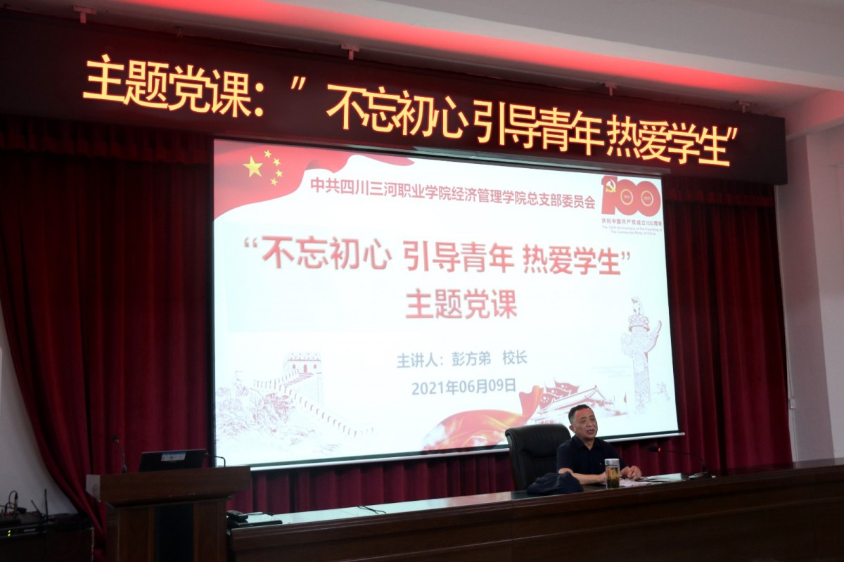 6月10日晚,四川三河职业学院校长彭方弟教授为经济管理学院讲授《不忘初心 引导青年 热爱学生》专题党课,经济管理学院全体教职工、学生代表参加党课学习,党课由经济管理学院院长兼党总支书记冯俊学副教授主持。