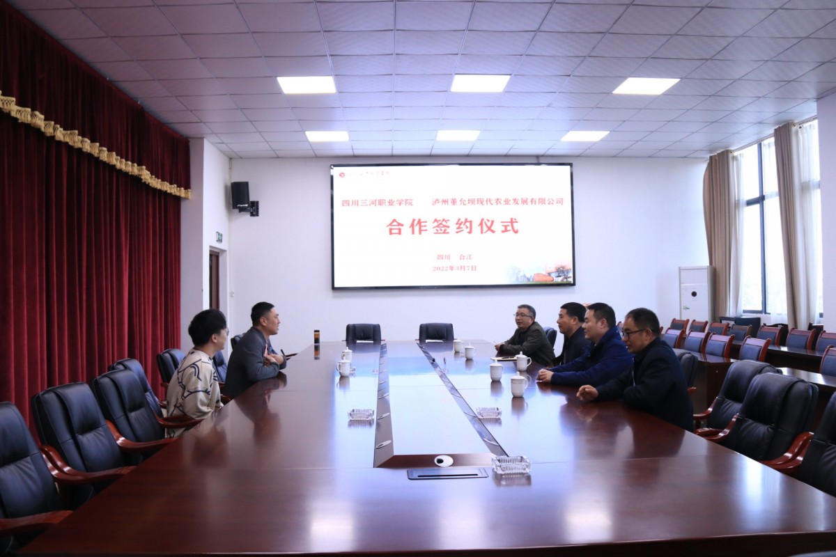 3月7日,四川三河职业学院与泸州董允坝现代农业发展有限公司校企合作签约仪式在学校二会议室举行。泸州董允坝现代农业发展有限公司董事长王黔、公司运营部经理文亚宇,少岷教育集团董事长王忠平、三河职业学院执行董事王文潇、集团副总裁胡怀志、三河职业学院副校长蒲先祥和现代农业技术学院院长徐恢仲出席签约仪式。