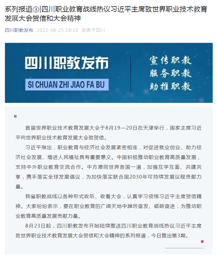 下一篇:四川职教发布:四川职业教育战线热议习近平主席致世界职业技术教育发展大会贺信和大会精神