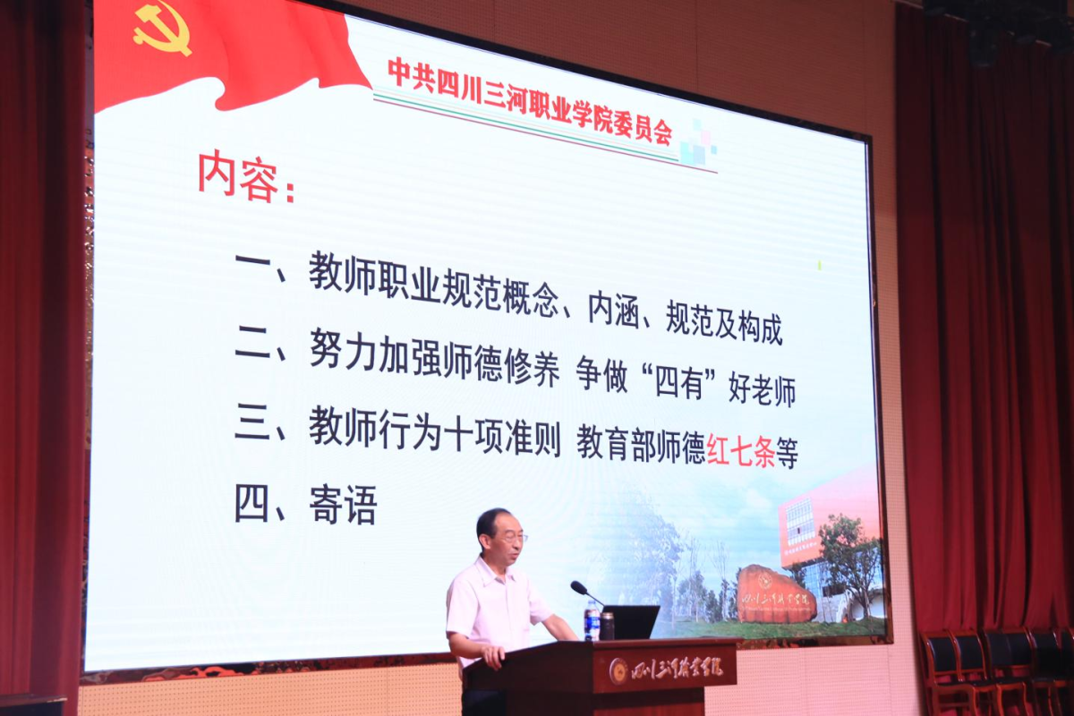 党委书记叶昌伦以《弘扬崇高师德,争做“四有好老师”》为题,为新教师进行师德师风专题培训讲座。他从教师职业规范的概念、内涵、规范及构成,努力加强师德修养、争做“四有”好老师,教师行为十项准则等三方面要求新教师们要大力提升教师职业道德素养,忠诚于党的教育事业,潜心教书育人,关心爱护学生,真正做到学高为师,身正为范,做“经师”与“人师”的表率。