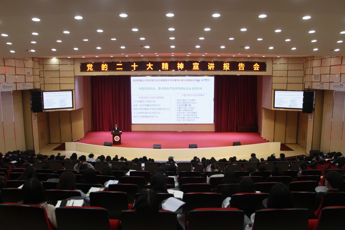 在两个多小时的宣讲报告中,杜乾举教授从深刻把握党的二十大主题、深刻把握过去五年工作和新时代十年的伟大变革、深刻把握开辟马克思主义中国化时代化新境界的历史责任、深刻把握构建人类命运共同体的重大意义、深刻把握加强党的全面领导和全面从严治党部署要求、深刻把握应对风险挑战的重要要求、深刻把握以中国式现代化全面推进中华民族伟大复兴的使命任务等方面对党的二十大精神进行解读。整场宣讲会聚焦党的二十大精神的重点和关键,内涵丰富、系统全面、生动翔实。