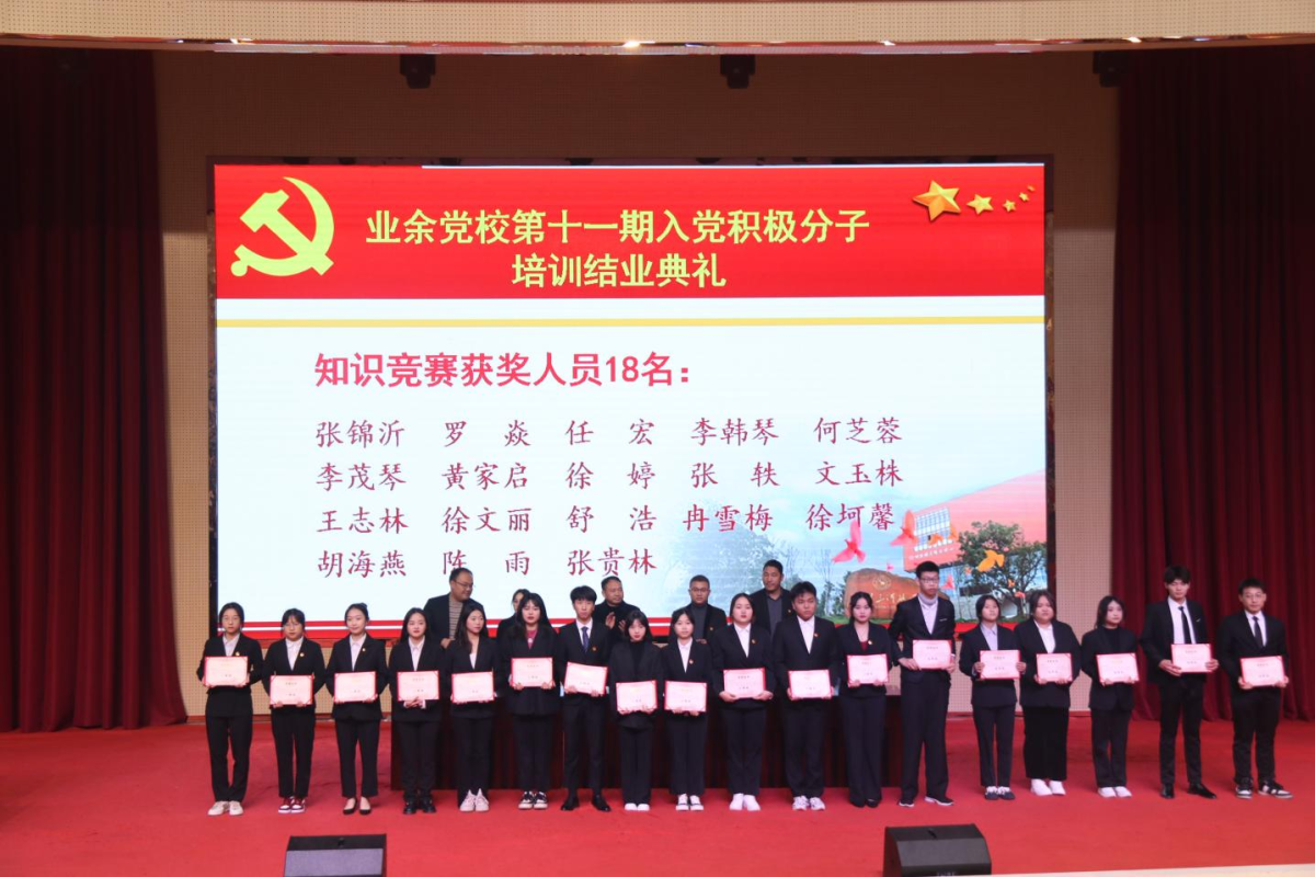 学院业余党校第十一期入党积极分子培训班历经7个月时间,采取线上线下学习、集中授课和社会实践,开展了“喜迎二十大、永远跟党走”读书征文演讲、“学习贯彻二十大精神、团结奋进新征程”知识竞赛和志愿服务等,顺利完成培训计划内容,结业典礼在嘹亮的《国际歌》歌声中圆满结束。(撰稿人:苟超群)
