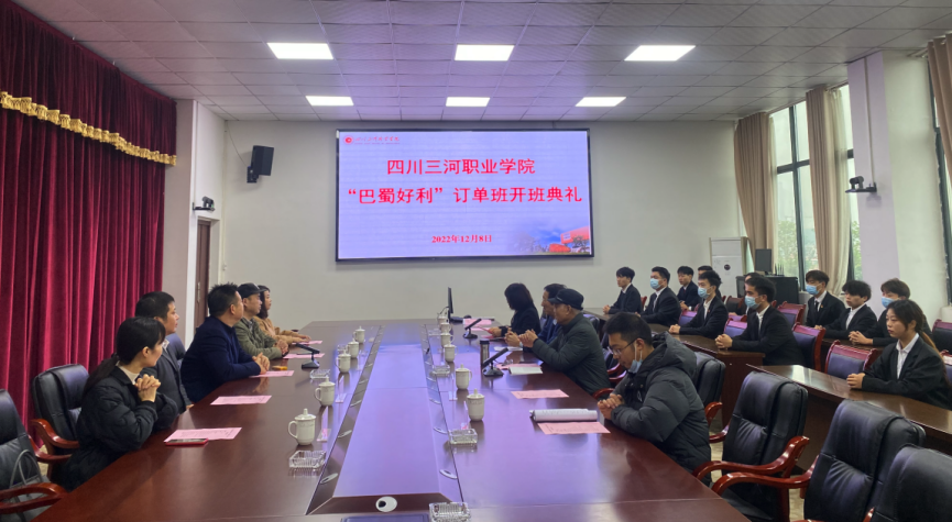 为深化校企合作,提升人才培养质量,做好学生就业保障,2022年12月8日,四川三河职业学院在第二会议室召开第四届“巴蜀好利”订单班开班典礼。四川巴蜀好利食品有限公司董事长刘勇、副总经理姜华,学校副校长吴绍华、对外合作处处长周德湘、经济管理学院院长冯俊学、党总支副书记李联春等领导出席,2022级巴蜀好利订单班17名学生参加了开班典礼。