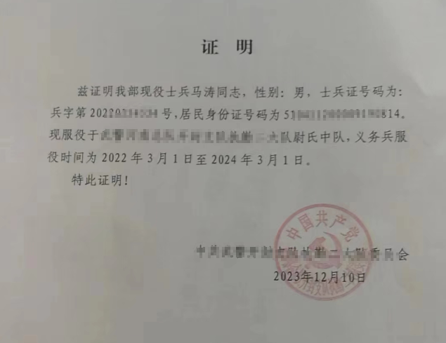 附件4:2026年3月退役的考生提供本人服役部队开具的证明材料样本