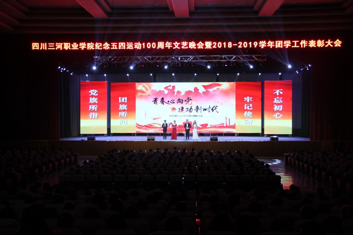 四川三河职业学院召开纪念五四运动100周年文艺晚会暨2018——2019学年团学工作表彰大会 为认真贯彻落实全国、全省教育大会精神,进一步团结和激励全校青年弘扬百年“五四”精神,凝心聚力开创四川三河职业学院发展新局面,5月4日晚,四川三...