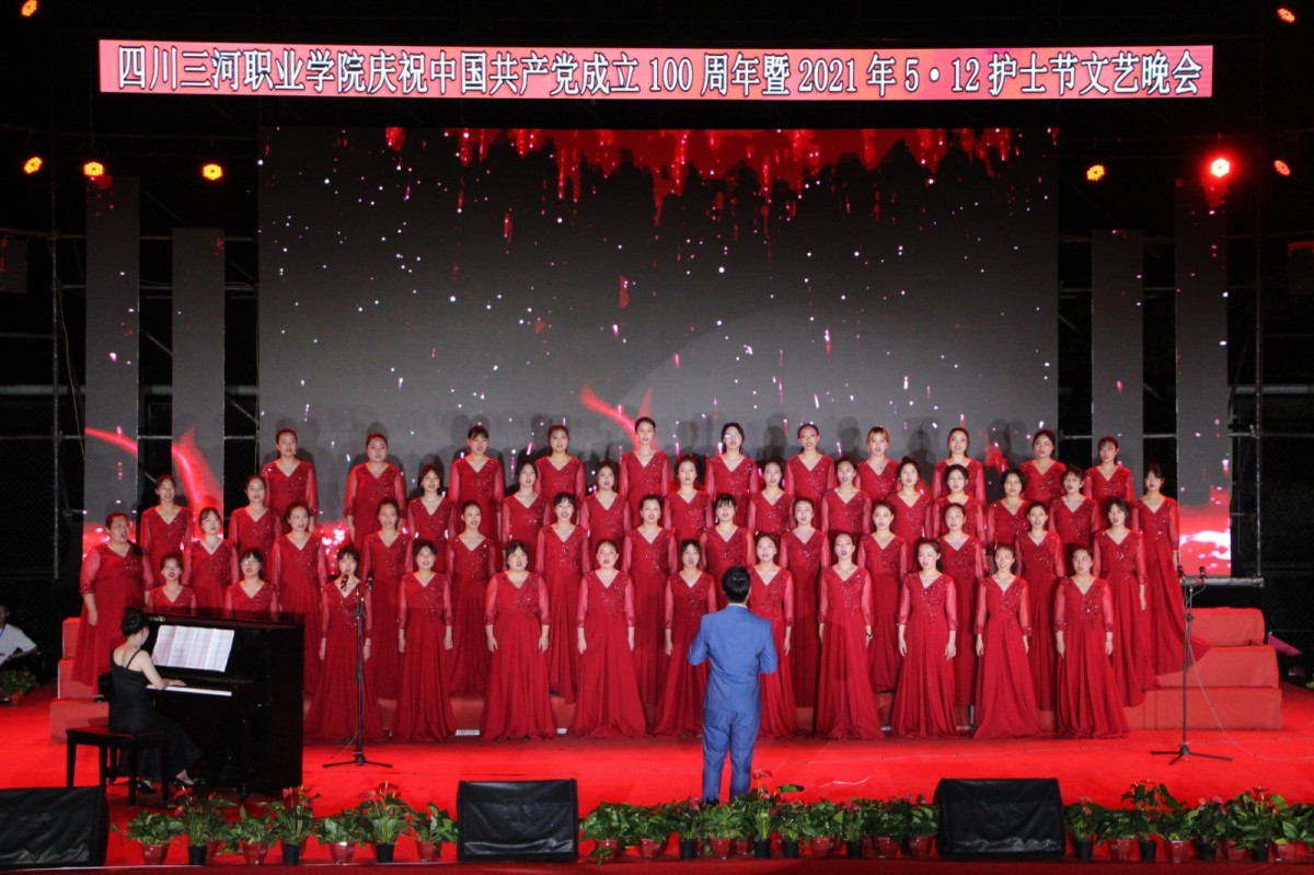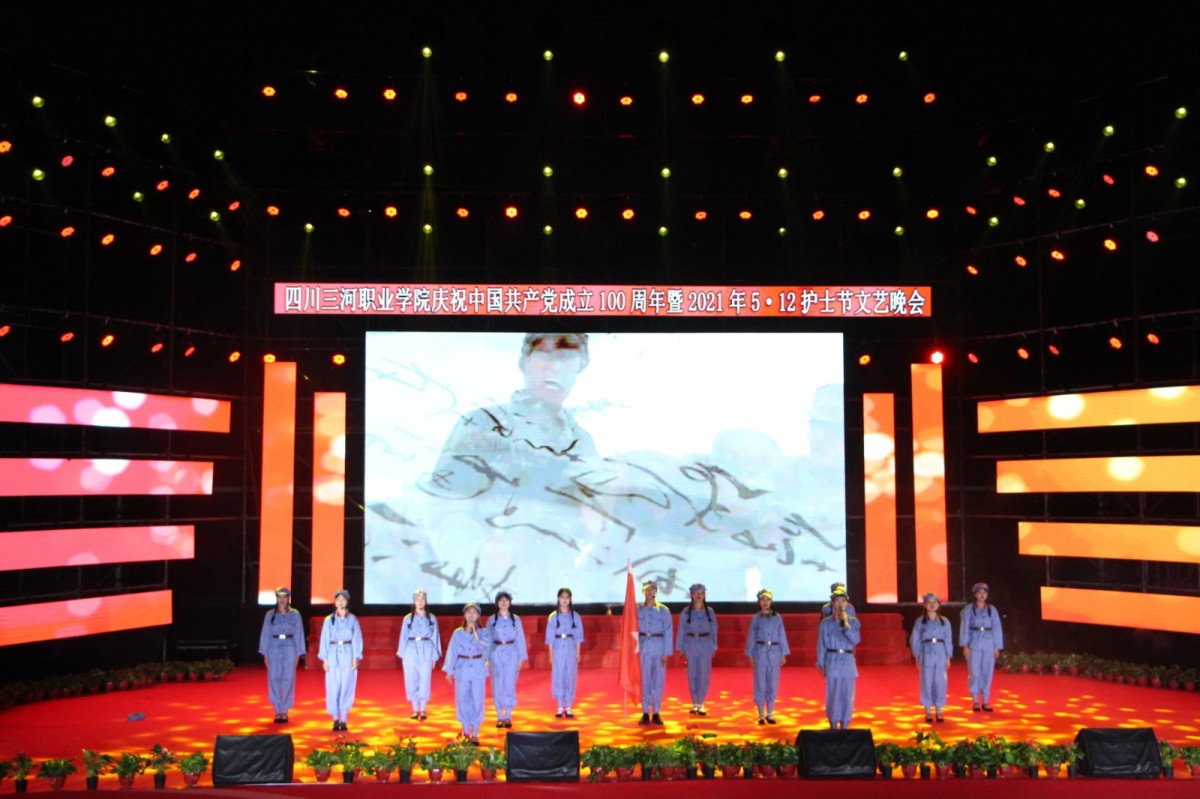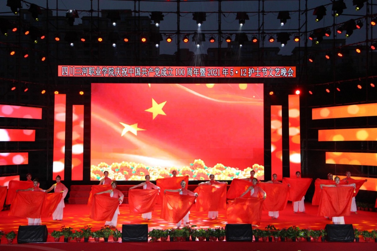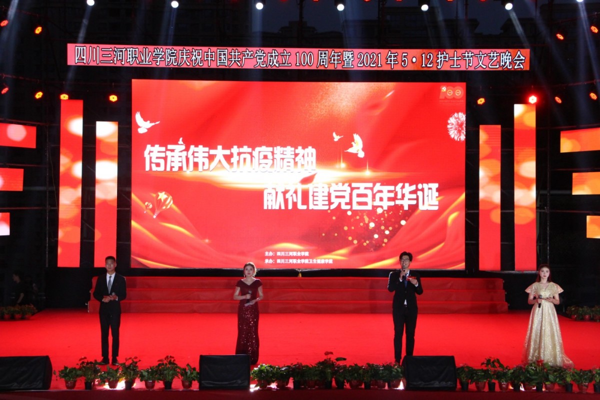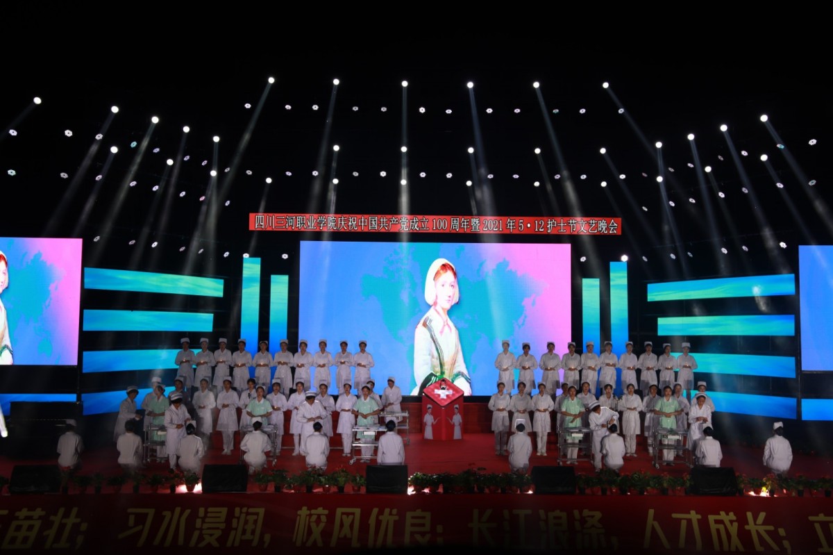 为传承伟大抗疫精神,献礼建党百年华诞,5月9日晚,四川三河职业学院榕树广场灯光璀璨、霓虹闪耀,由学校主办,卫生健康学院承办的“四川三河职业学院庆祝中国共产党成立100周年暨2021年5.12护士节文艺晚会”盛大举行。学校党委、行政领导,各部门及二级学院领导干部,合江县人民医院、中医院等嘉宾莅临晚会现场。6000余名师生参加了晚会。