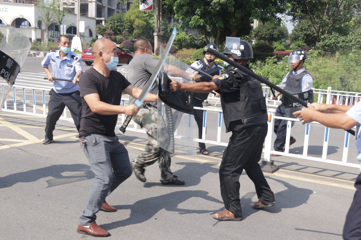 “暴恐分子”看到有其他人员在赶来,于是从身后拿出砍刀就向门卫砍去,被门卫用盾牌挡住,这时特勤人员赶到,看到“歹徒”和门卫在周旋,大家按日常训练的三人一组,分别持盾牌、钢叉、齐眉棍成丁字前突拦截,将“歹徒”制服押送。
