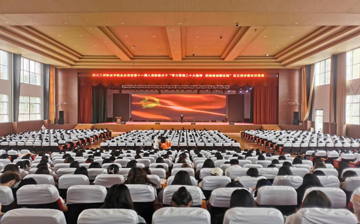 11月21日中午,四川三河职业学院业余党校在博山礼堂举行“学习贯彻二十大精神 团结奋进新征程”读书征文演讲暨知识竞赛。业余党校校长邬正福、二级学院学生支部书记及业余党校第十一期培训班学员900余人参加活动。