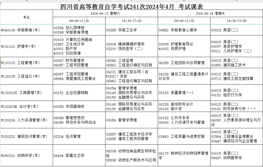 转载部分四川省高等教育自学考试( 24.1次) 2024年4月考试课表、课程简表