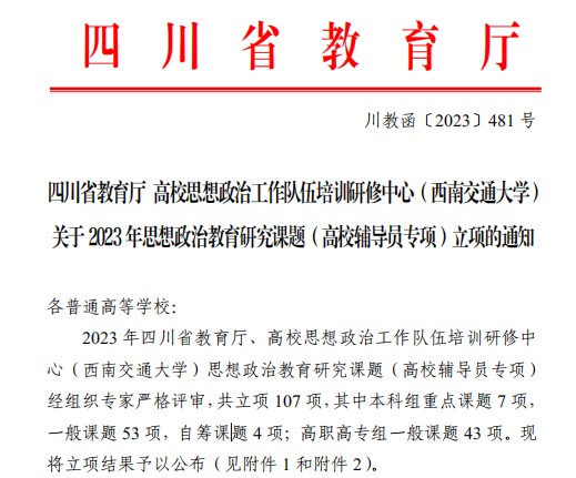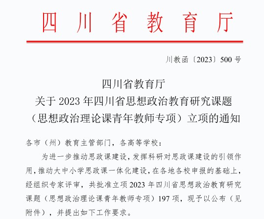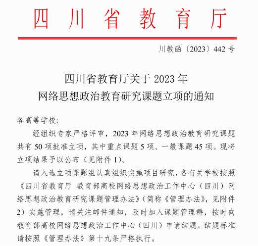 近日,四川省教育厅公布了2023年思想政治教育研究课题立项结果,我校教师共获批立项4项,其中思想政治理论课青年教师专项1项,辅导员专项2项,网络思想政治教育专项1项。