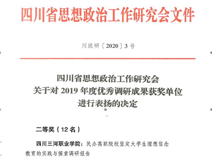 四川三河职业学院荣获四川省思想政治工作研究会2019年度优秀调研成果二等奖2020-04-24
