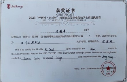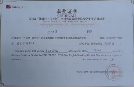 2023年10月28日至29日,四川三河职业学院组织学生参加由四川省教育厅主办的2023年“中银杯”四川省职业院校技能大赛Uchallenge大学生英语挑战赛省赛,来自全省66所学校的272个团队、332名选手报名参加本次挑战赛。我校外语教研室刘汝茜和张爱玲老师带领选手参加英语演讲和写作两项比赛,经济管理学院会计22级03班学生江仕昊荣获省级演讲比赛三等奖,卫生健康学院中药学22级02班学生付椿荔荣获省级写作比赛三等奖。
